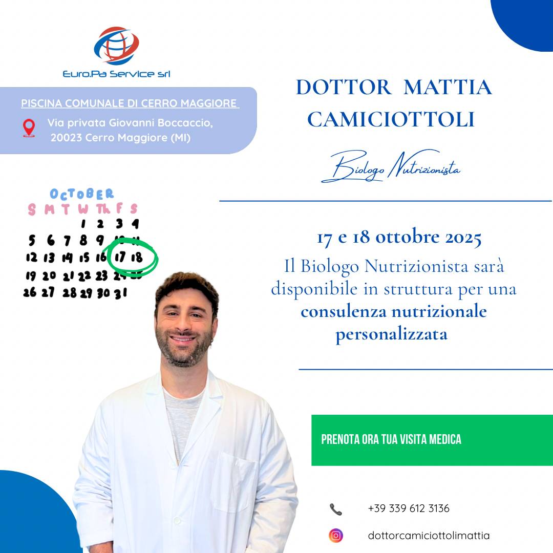alla terapia medica quando indicata) problemi di natura clinica come diabete, osteoporosi, dislipidemie, IBS, celiachia ecc. Gli interessati possono richiedere un appuntamento contattando direttamente al n. 339.6123136. Nel mese di ottobre il Dott. Camiciottoli sarà presente il 17 e il 18.